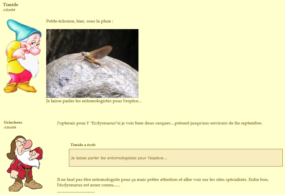 Ben voila, le mot de la fin!!: Plutôt que de vouloir jouer les apprentis sorcier en identifiant sans en avoir les moyens le genre ou l'espèce d'une mouche naturelle, il serait bien plus simple, plus réaliste et tout aussi efficace....., de reconnaître simplement l'artificielle qui, sans s'embarrasser de détails microscopiques inutiles et impossibles à reproduire au montage, la représenterait le mieux, à l'aide de ce tableau de correspondances "Naturelles-Artificielles" PS: pour faire identifier une mouche par des spécialistes, mettez la dans un flacon d'alcool à 70° et envoyez-la avec le maximum d'informations sur les circonstances et le lieu de sa capture au